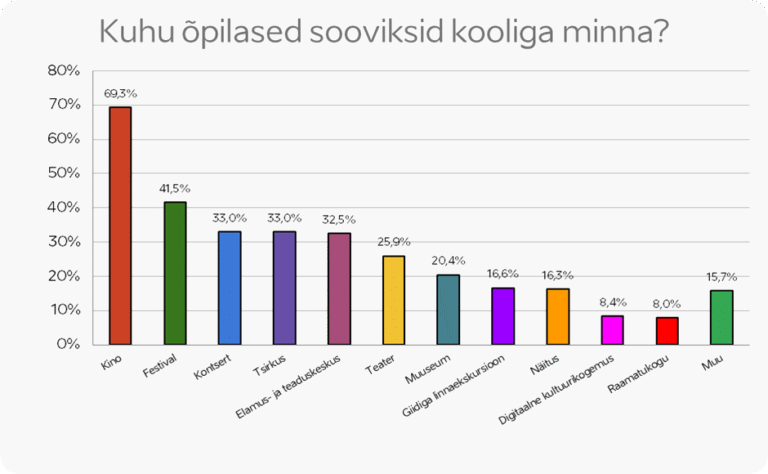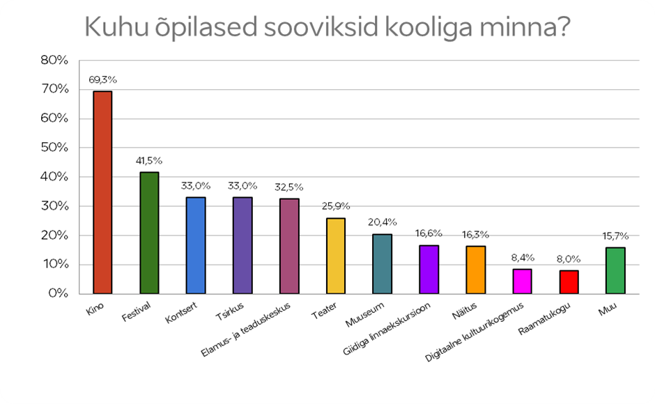 Õpilased ise avaldavad aga enim soovi käia kas rohkem kinos (69%) või just festivalidel (41%), kontsertidel (33%), tsirkuses (33%) või elamus- ja teaduskeskustes (32%). Noored eelistavad oma tagasisides selgelt nii aktiivse kaasamisega haridusprogramme kui ka põnevate ja uudsete kultuurisündmuste vahetuid elamusi.