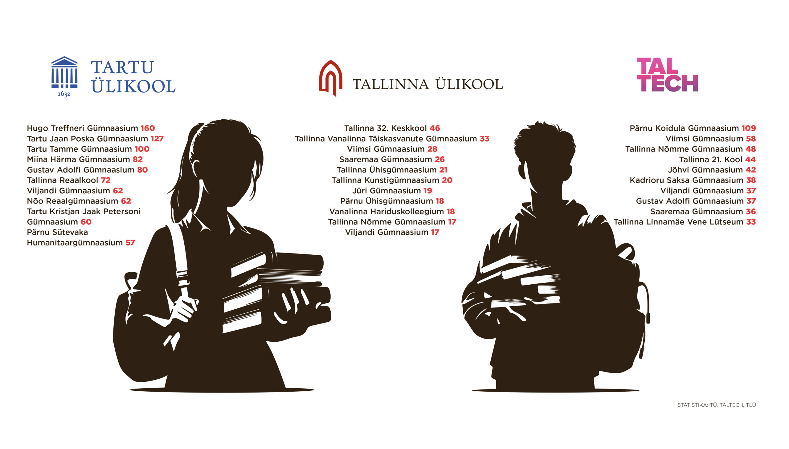 Ülikoolid hoiavad tublimatel gümnasistidel silma peal juba varakult ja jälgivad igal aastal, millistest koolidest neile õppima tullakse. Kes ja kust tulid tänavu õppima meie kolme suuremasse ülikooli – TÜ-sse, TalTechi ja TLÜ-sse?