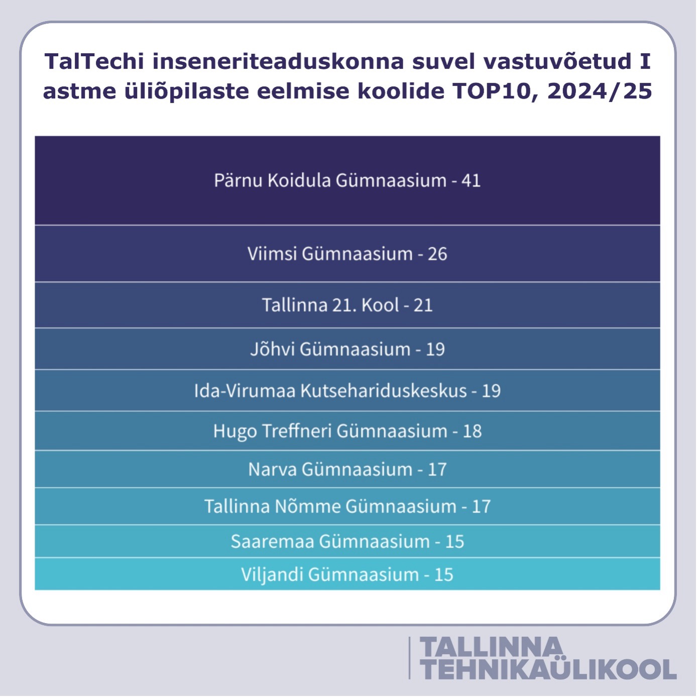 Esiviisikus troonivad Tartu koolid: Hugo Treffneri Gümnaasium (160), Jaan Poska Gümnaasium (127), Tartu Tamme Gümnaasium (100), Miina Härma Gümnaasium (82) ja kohe nende kannul pealinnast Gustav Adolfi Gümnaasium ja Tallinna Reaalkool.