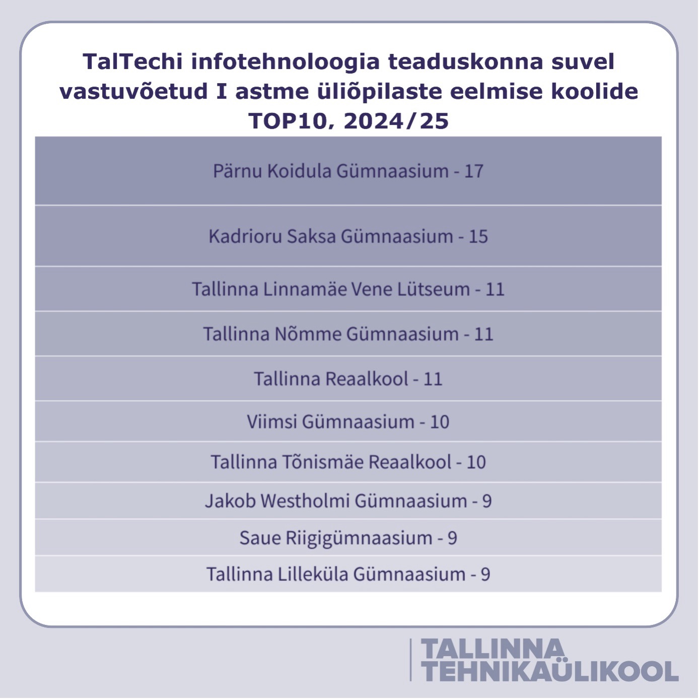 Tallinna Ülikooli sisseastujate esiviisikus on Tallinna 32. Keskkool (46), Tallinna Vanalinna Täiskasvanute Gümnaasium (33), Viimsi Gümnaasium (28), Saaremaa Gümnaasium (26) ja Tallinna Ühisgümnaasium (21).