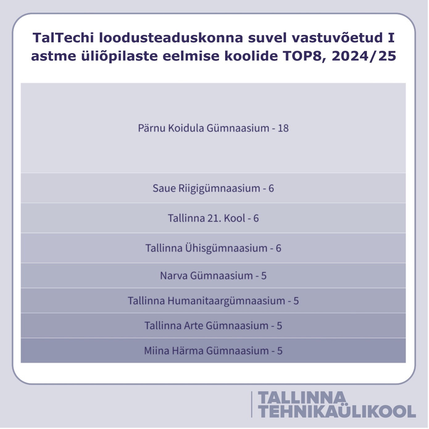 Kokku alustas tehnikaülikoolis kahel õppetasemel õpinguid 2919 esmakursuslast. Nagu viimastel aastatel tavaks, pärineb kõige rohkem uusi üliõpilasi Pärnu Koidula Gümnaasiumist (109). Tõusu jätkab Viimsi Gümnaasium (58), kolmandaks on kerkinud TalTechi naaber – Tallinna Nõmme Gümnaasium (48).