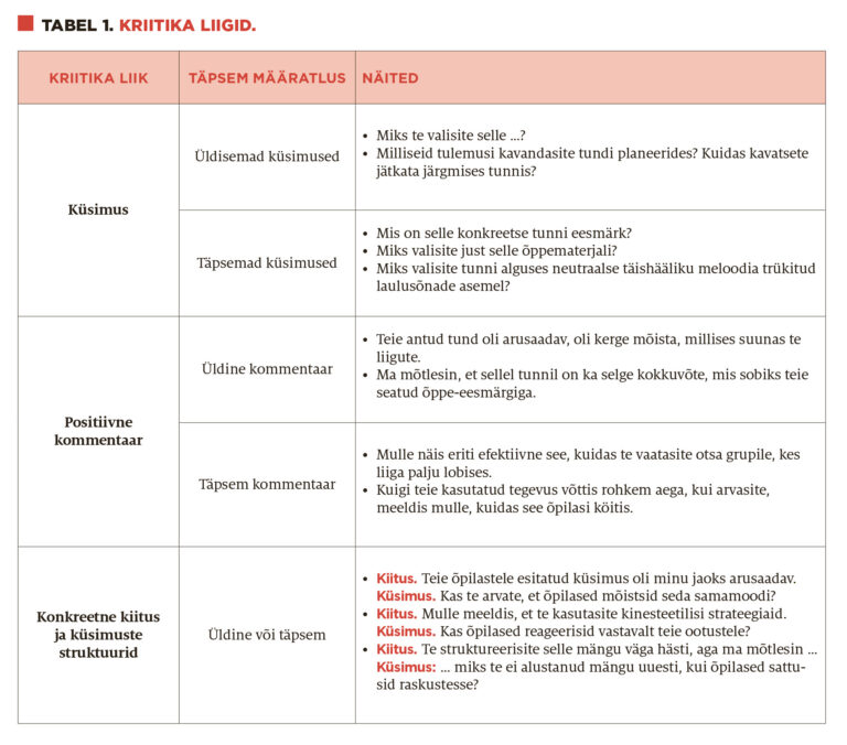Et õpetada üliõpilastele, kuidas kaastudengeid mõjuvalt arvustada, tuleb õpetada neid vaatlema tunde arukalt ja aspekte eristavalt või vastupidi – tervikuna. Eristussuutlikkus eeldab õppimist, kogemust ja õpetamistehnikate lõputult avarduvat repertuaari. Astmeline analüüs aitab algajaid õpetajaid õppida ja harjutada kriitikat vastu võtma osade kaupa ja järk-järgult. Meie osakonna tudengeid harjutatakse kriitikaga vastavalt sellele, kui kogenud nad on ja kui kaugele on nad jõudnud meie õpetajakoolituse õppekava läbimisega.