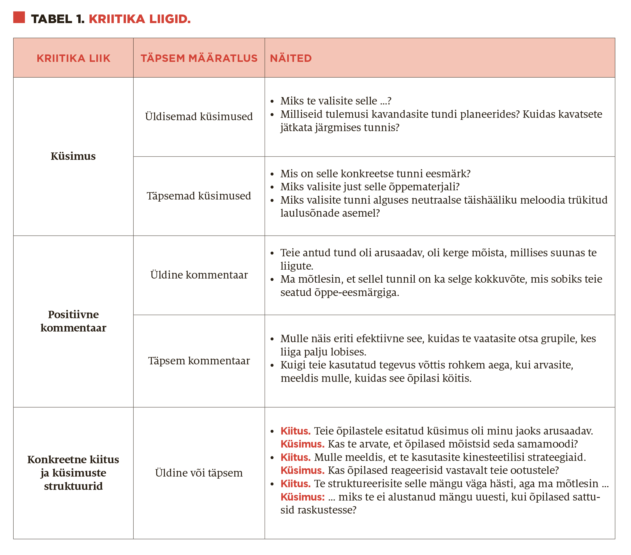 Miks võivad küsimused olla kriitika tegemise vormiks? Meie kaastudengite kogemuse kohaselt selleks, et näidata üles huvi või esitada selgitust nõudvaid küsimusi, väljendamaks arvamust selle kohta, mis äsja tunnis juhtus. Küsija juhib tähelepanu tunni mõnele aspektile, nagu see oli kavandatud, õpitud või kogetud. Eeldades, et küsimused on moodustatud eeltoodud kuut tunnust silmas pidades, suunab küsija uudishimu tundi andnud tudengi eemale nn varjuotsivast vastusest ja paneb ta mõtlema, mis põhjustas tunni mõistmisel nii erineva seisukoha.