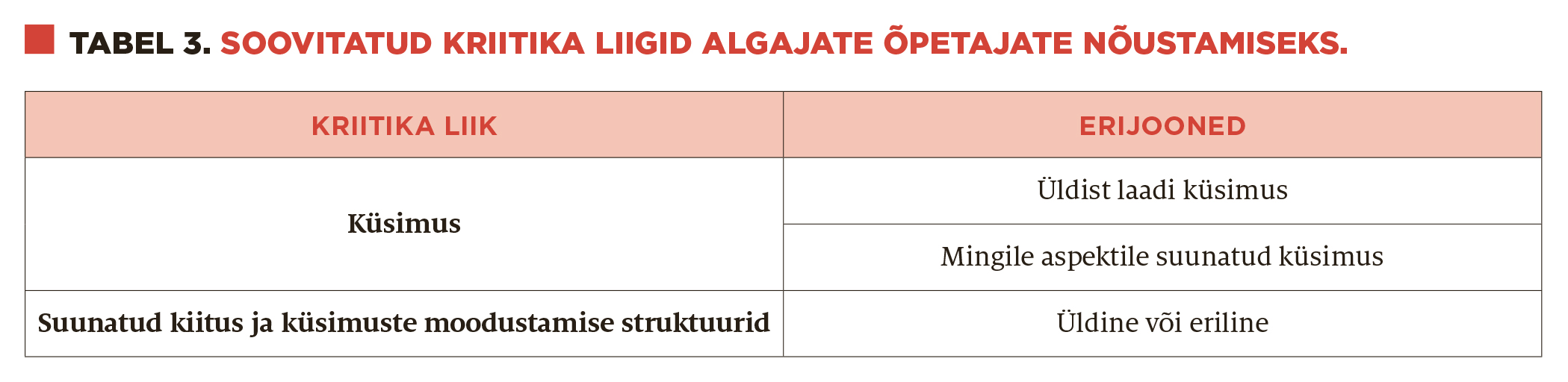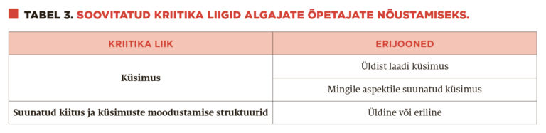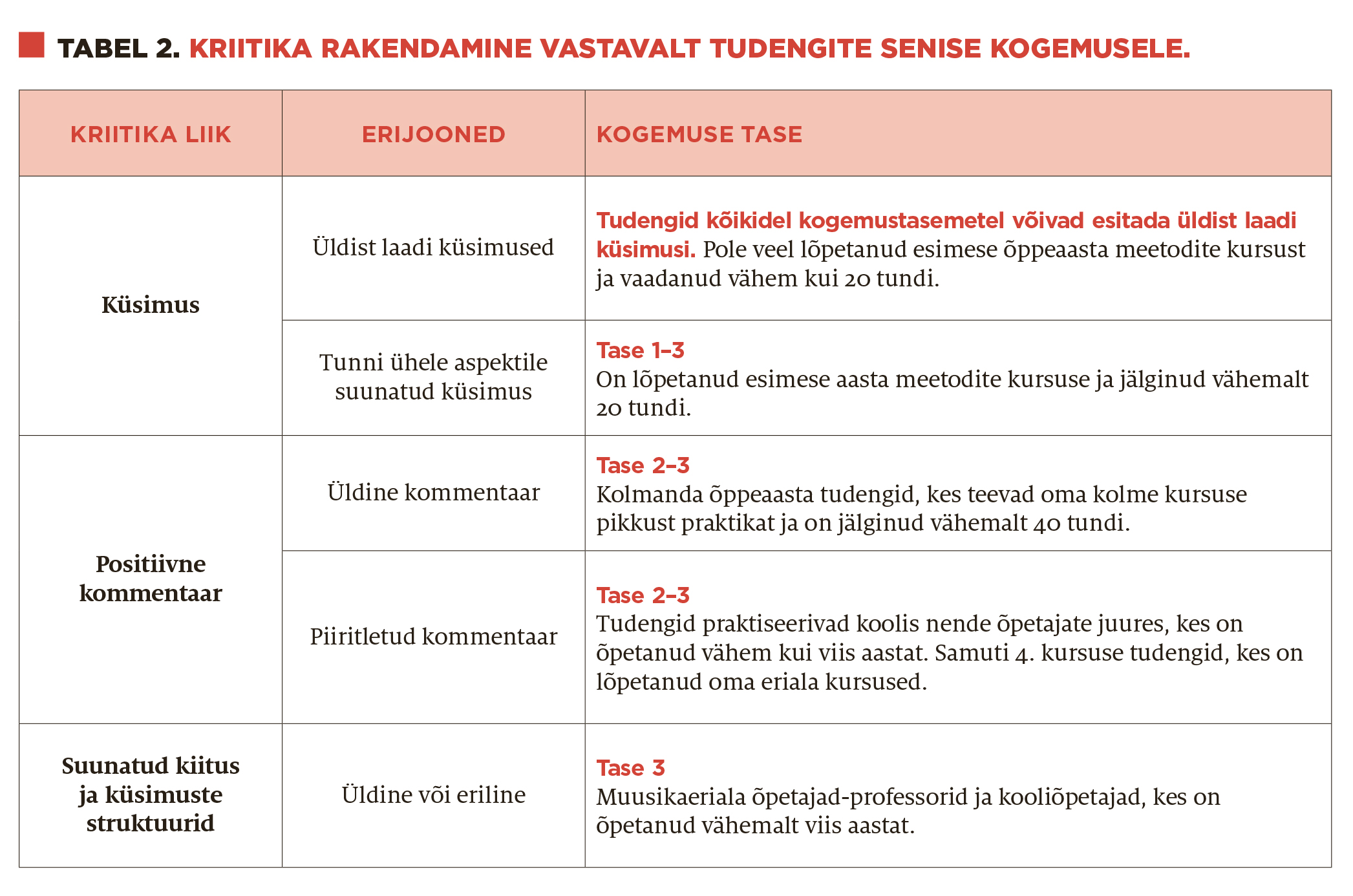 Tabel „Kriitika rakendamine vastavalt tudengite senisele kogemusele“ illustreerib selle kriitika korraldust. Kogemuse tasemeid on võimalik iga koolitusasutuse jaoks sobivaks kujundada ja ümber sõnastada.