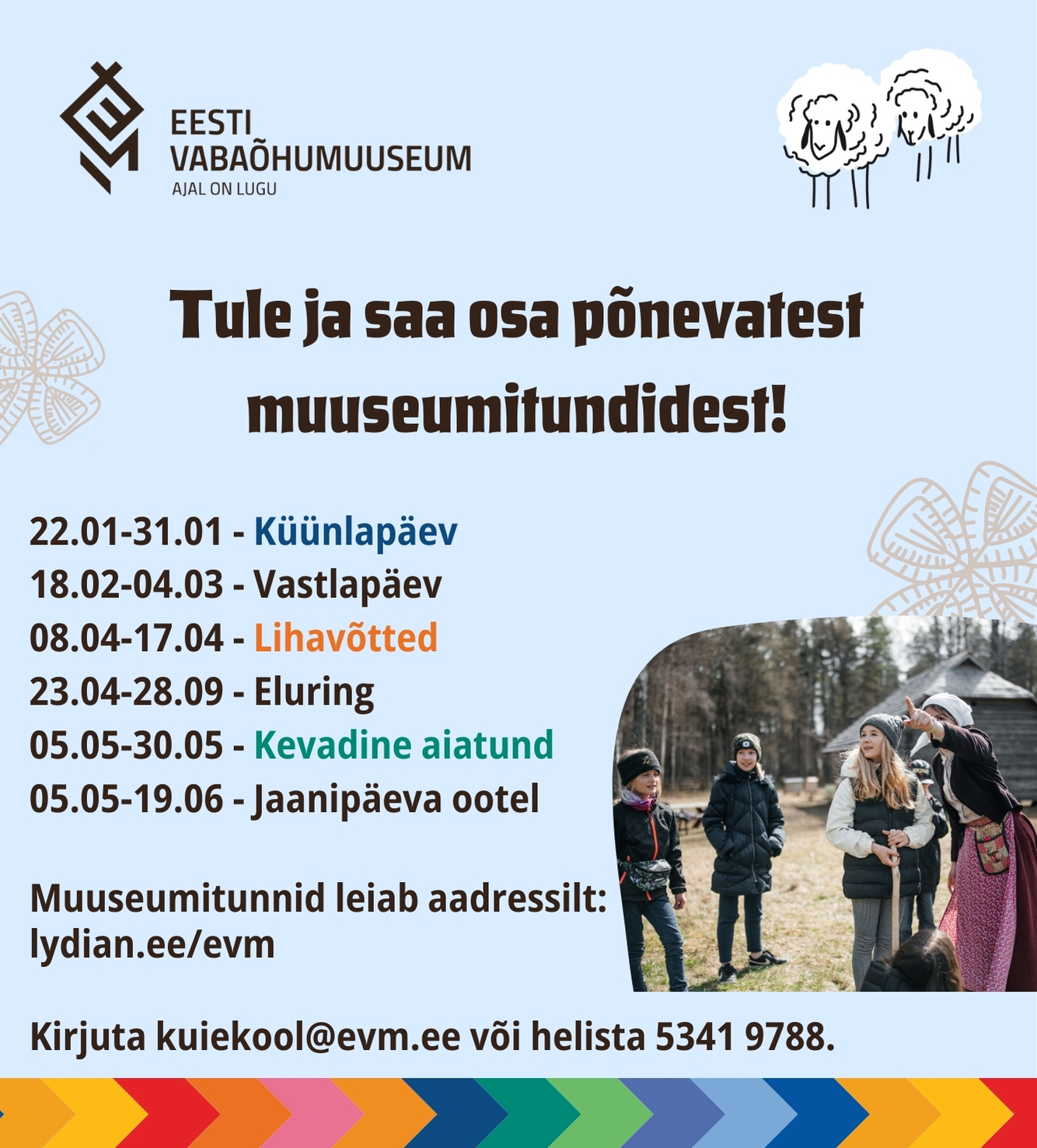 Eesti Vabaõhumuuseumi haridusprogrammidesse saab mugavalt broneerida veebikeskkonna lydian.ee/evm kaudu või külastades muuseumi kodulehte evm.ee/haridus