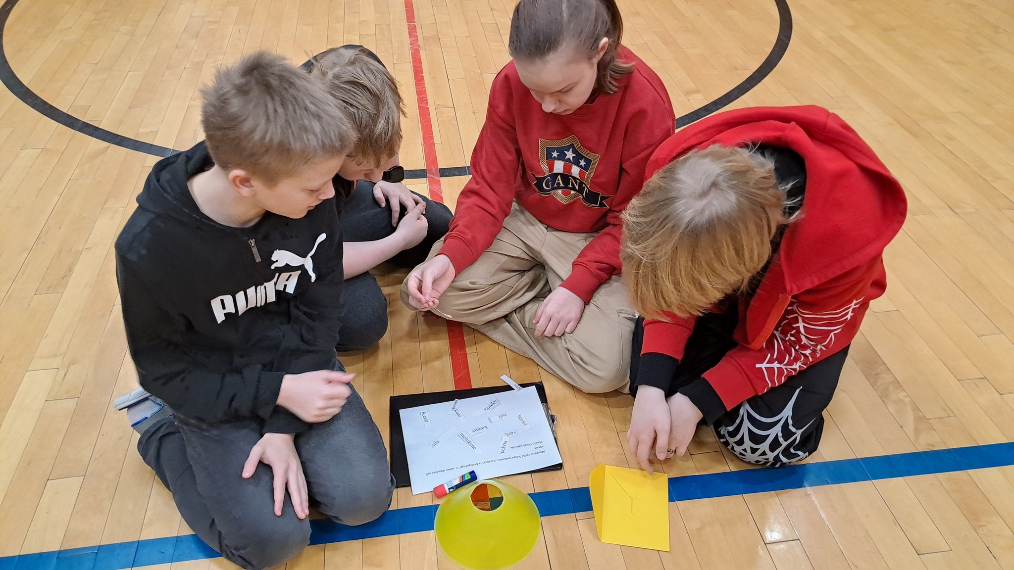 Ära ei unustatud ka liikumist. Üks tund toimus kõikidele võimlas, kus rühmad pidid läbima viis pesa. Igas pesas olid erinevad ülesanded, mis tulid aja peale ära lahendada. Ühes pesas olid tuntud eesti kirjanike nimedest moodustatud anagrammid. Nende lahendamisega ühelgi võistkonnal raskusi ei olnud. Teises pesas pidid lapsed kokku viima kirjaniku ja tema loodud raamatutegelase. Kolmandas pesas oli tekst, kuhu olid peidetud raamatute pealkirjad. Lapsed pidid need üles leidma ja õigesti välja kirjutama. Eriliseks pähkliks osutus pesa, kus olid luuletuse ühe salmi sõnad lahti lõigatud ning õpilased pidid need õigesti ritta seadma. II ja III kooliastme õpilastele oli valitud temaatiline luuletus „Emakeel ja keelepeksja“, mille autoriks Heiki Vilep. Viimases pesas oli vaja kokku panna kirjaniku pilt, mis oli pusletükkideks lõigatud. 1.–3. klass pidid kokku panema Aino Perviku pildi, 4.–6. klass Leelo Tungla pildi ja 7.–9. klass Reeli Reinausi foto.