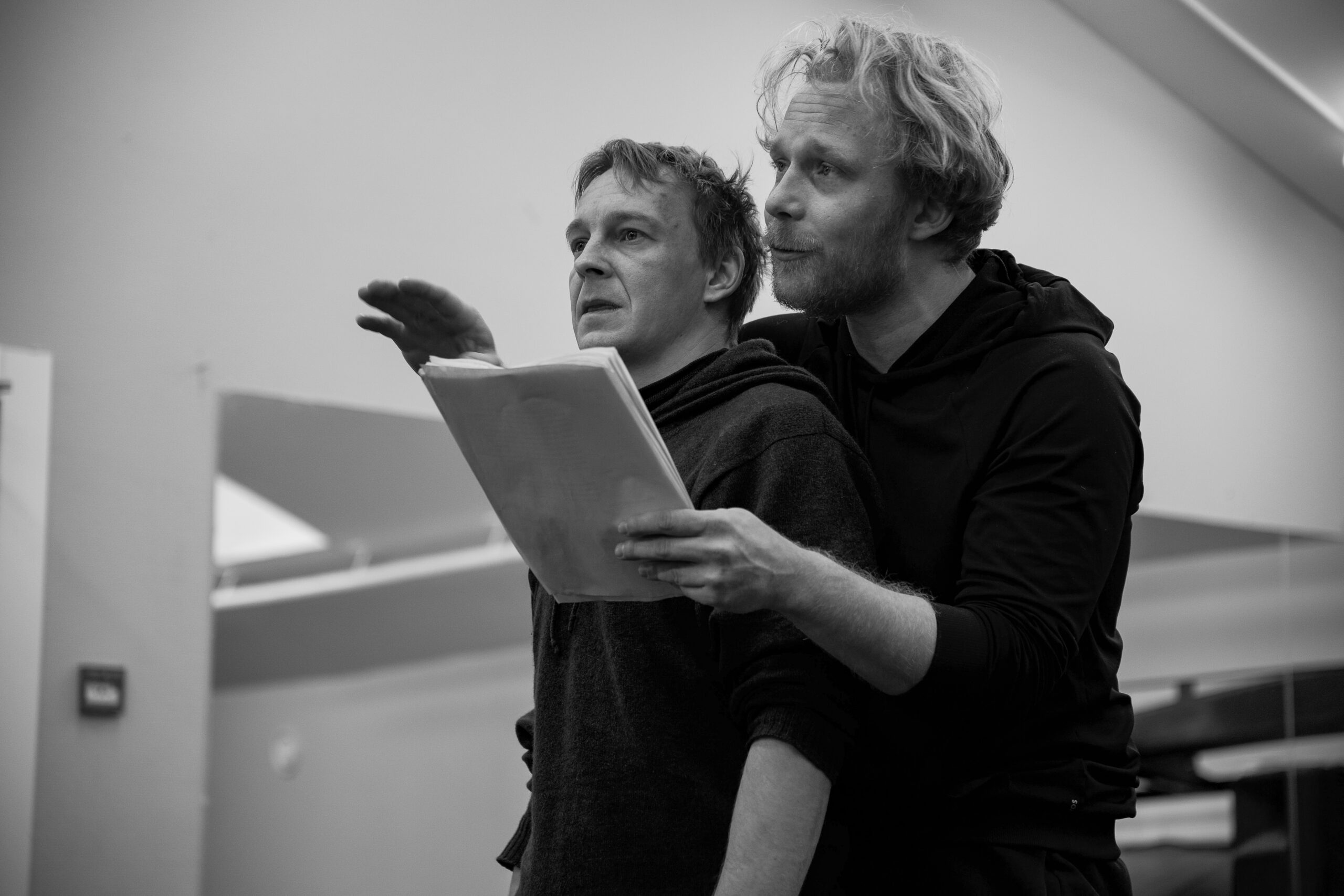 Näitlejad Pääru Oja ja Meelis Põdersoo lavastuse „Kullervo“ proovis. Foto: Rebeca Parbus