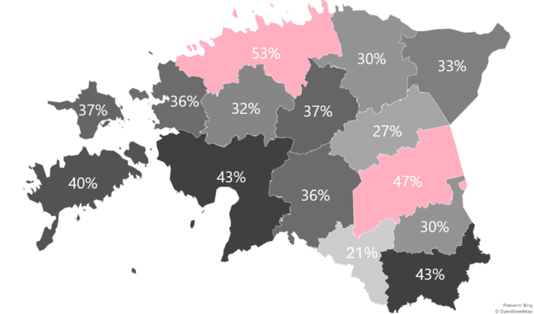 Joonis 1. 7–19-a lapsed, kes käivad huvikoolis, osakaal maakonna lõikes. Andmed perioodist 2020–2023. Allikas: Statistikaamet, Arenguseire Keskuse arvutused