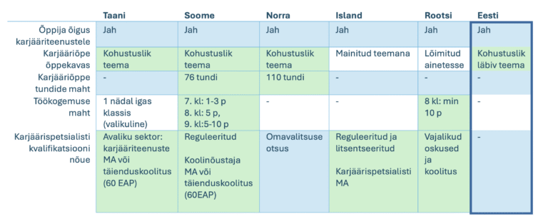 Põhjamaade ja Eesti karjääriteenuseid võrreldes ilmneb, et kuigi kõikides riikides on õpilastel seaduslik õigus karjäärialasele toele, varieeruvad seadused ja õppekava rakendamise viisid märkimisväärselt.