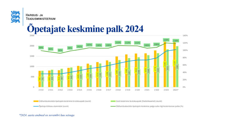 Riik ja omavalitsus panustasid möödunud aastal õpetaja palkadeks kokku 327 miljonit eurot (ilma maksudeta), millest riigi toetus moodustas 98% ja KOV-i lisapanus 2%. 38 omavalitsust (3,9 mln euro ulatuses) ei ole riigi eraldatud toetust täielikult ära kasutanud, samas kui 41 omavalitsust on panustanud oma rahakotist juurde kokku kümme miljonit eurot.