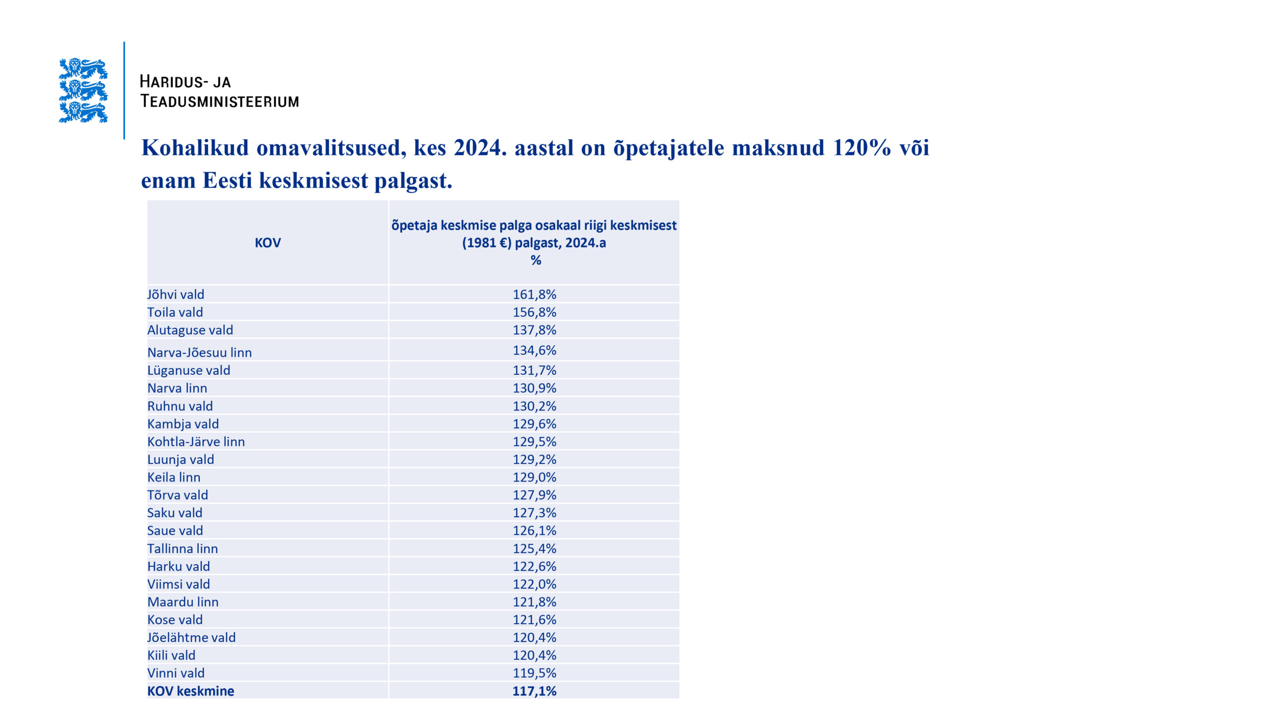 Eestis on 22 kohalikku omavalitsust, kes 2024. aastal on õpetajatele maksnud 120 protsenti või enam Eesti keskmisest palgast. Esikohal on juba nimetatud Jõhvi vald 161,8 protsendiga. Lisaks Ida-Virumaa linnadele ja valdadele leiame priimuste hulgast näiteks Ruhnu (130,2%), Kambja (129,6%) ja Tõrva valla (127,9%). Tallinn on 125,4 protsendiga selle nimekirja teises pooles, kuid näiteks Tartu ega Pärnu pole esimese 22 omavalitsuse hulka mahtunud. Samas on nimekirjas Tallinna ümbritsevad nn kuldse ringi vallad.
