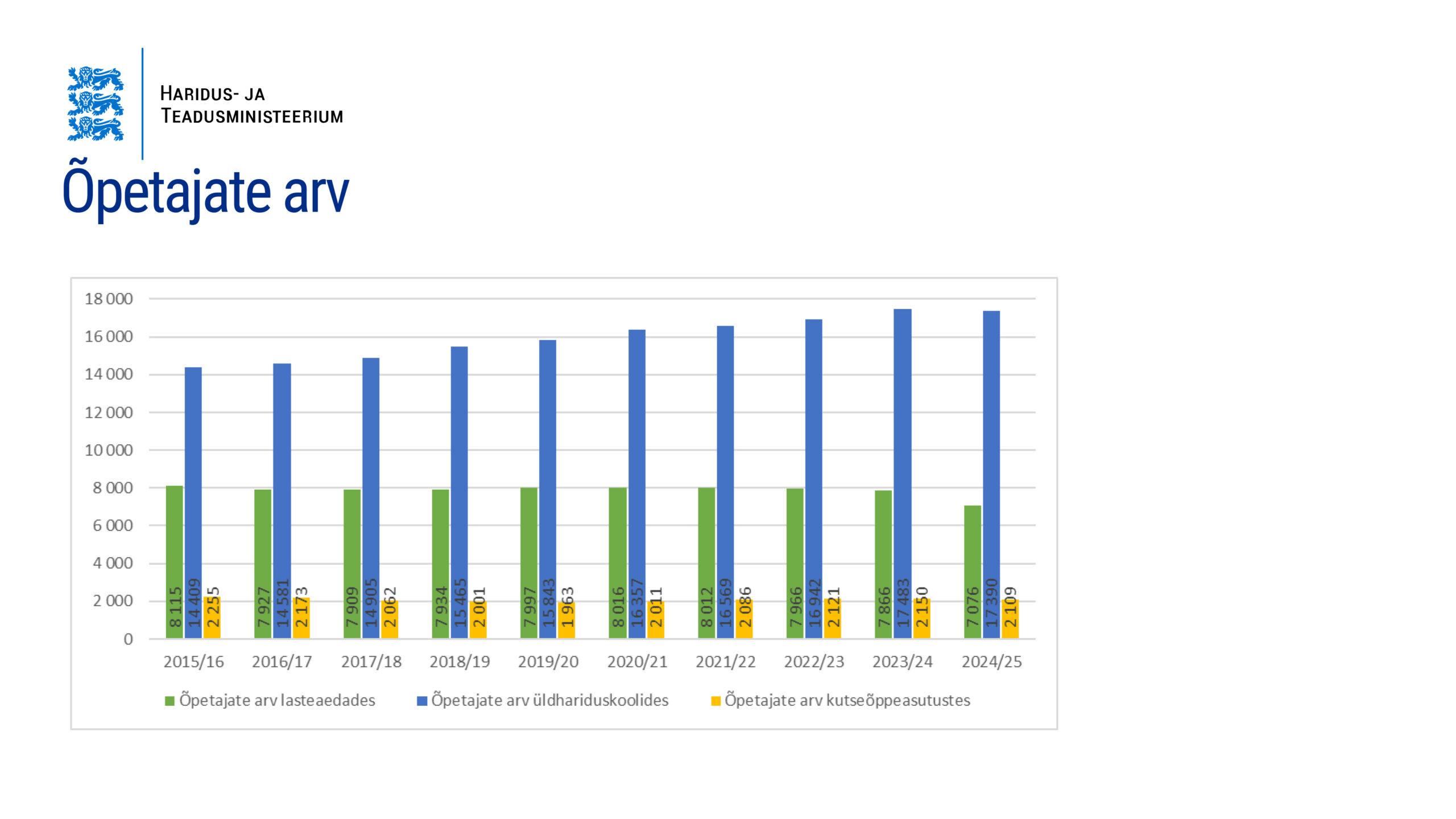 Eestis on 489 üldhariduskooli, kus töötab 17 390 õpetajat 14 341 õpetaja ametikohal. Seega on õpetaja keskmine koormus 0,82. Koolis on keskmiselt 9,8 õpilast õpetaja kohta. Möödunud aasta oktoobri seisuga õppis üldhariduskoolides 141 093 õpilast, mida on 2,7 protsenti vähem kui 2023 aasta oktoobris. Samas tõusis HEV-õpilaste osakaal õpilaste koguarvust 8,4 protsendini.