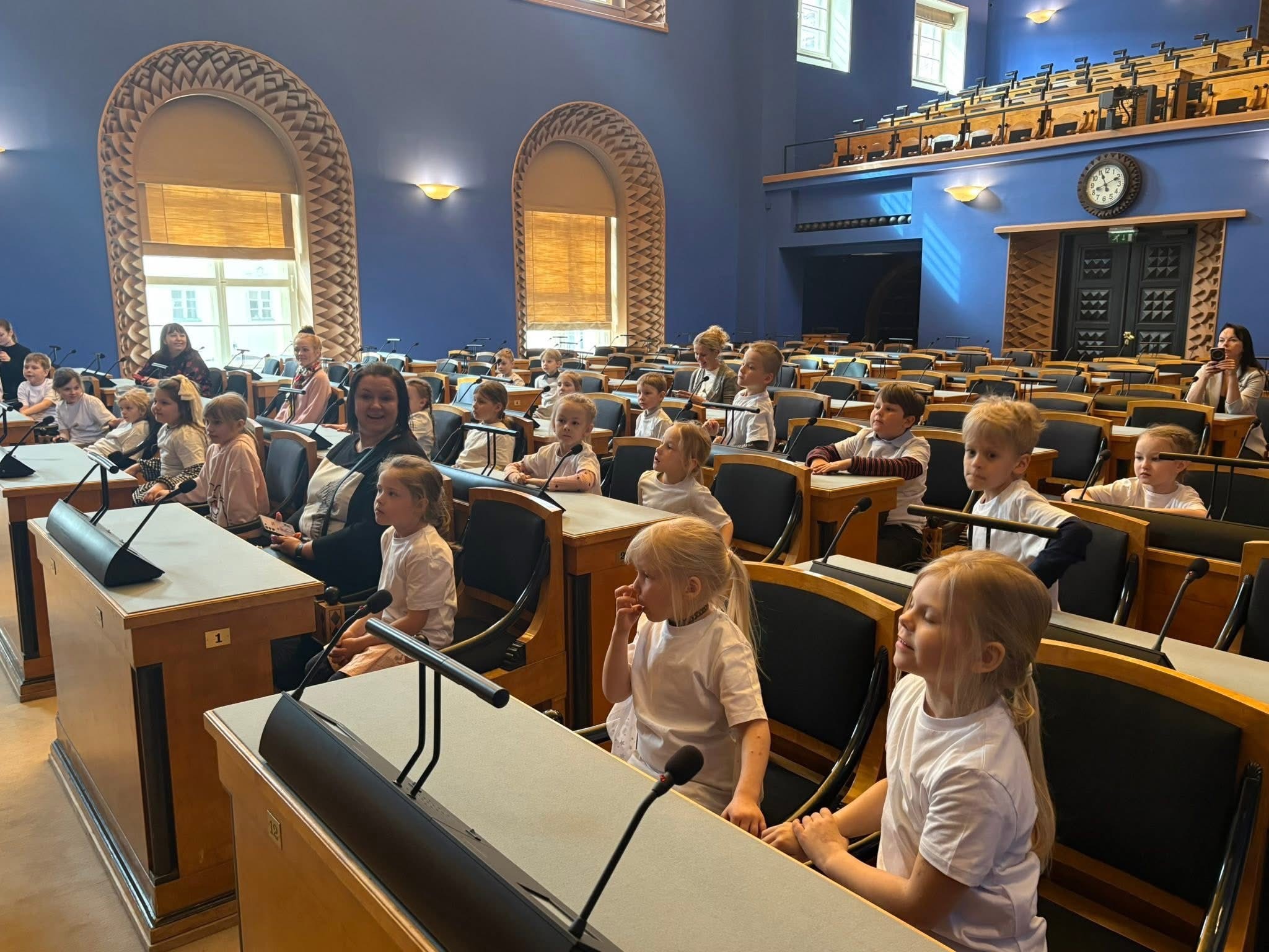 Viimane kohtumine toimus Eesti Vabariigi Riigikogus. Aprilli lõpus käisid ühendkogu lapsed paigas, millest palju räägitakse, kuid kuhu vähesed satuvad – Eesti Vabariigi Riigikogus. Meid võttis vastu Riigikogu liige Riina Solman. Meie tarkadel ja taiplikel lastel oli palju küsimusi, alates lossi ehitamisest kuni olukorrani Ukrainas. Juttu oli nii Suurupi looduskaitsealast kui ka Riigikogu laemaalingust. Iga detail paelus lapsi ja nende uudishimul ei olnud piire. Saime piiluda ka sellistesse ruumidesse, kuhu tavaliselt ei satuta, näiteks Riigikogu esimehe kabinetti, mis oli mõnus ja hubane, aga samas töine. Lastele meeldis eriti kuldne toon, mis ruumidele piduliku ilme andis. Loomulikult ronisime Pika Hermanni torni, kus lehvib uhkelt Eesti lipp. Ka laste küsimus, kui vana on Eesti riik, leidis vastuse – tänavu tähistas Eesti oma 107. aastapäeva.