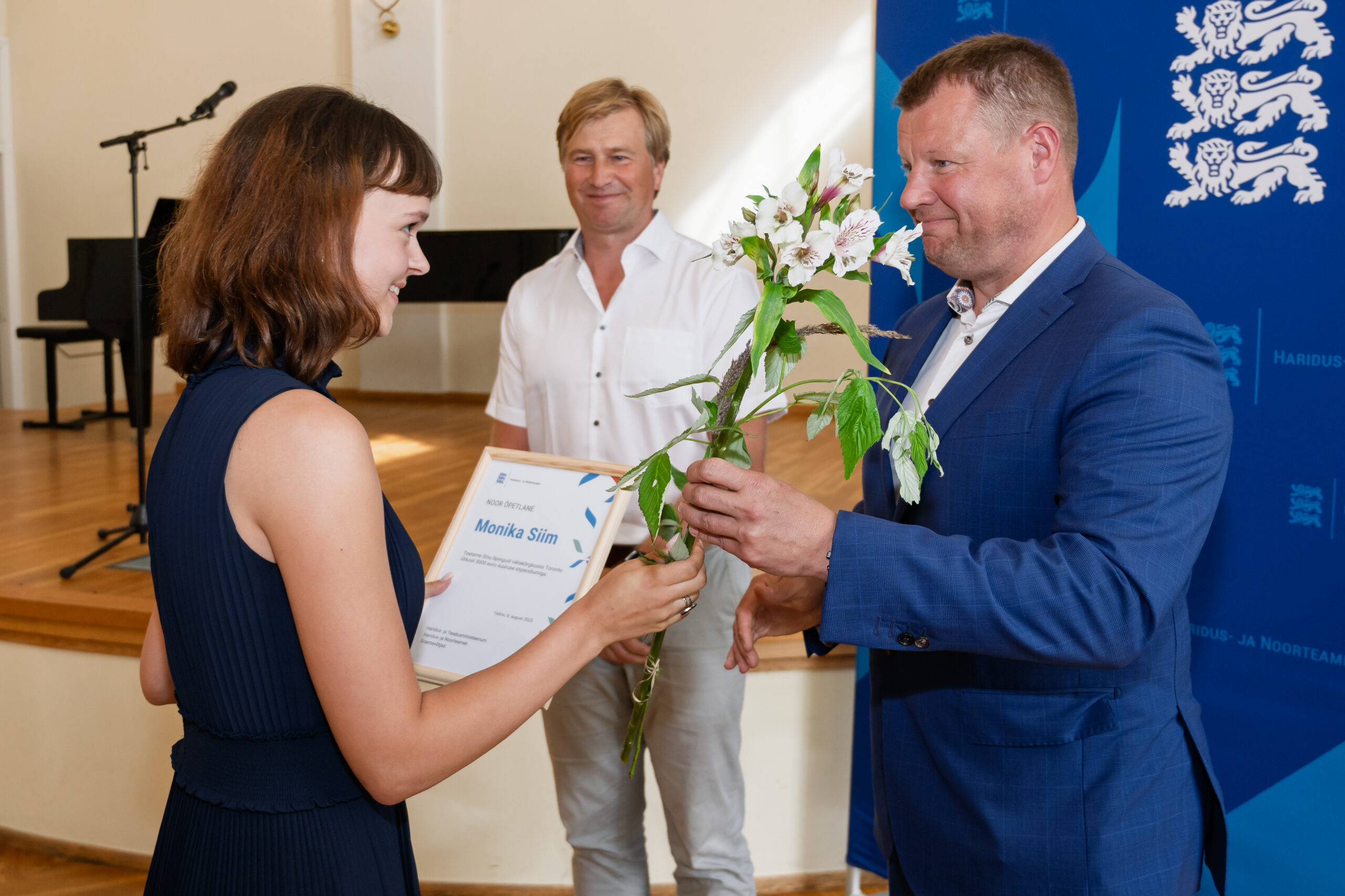 Harno peadirektor Jaak Raie (paremal) ja Kristo Käärmann andsid 20 koolilõpetajale üle Noore Õpetlase stipendiumi