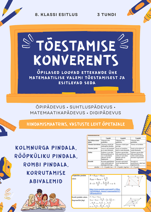 Kuigi õppekava toob üldpädevused ja õppija aktiivse rolli selgelt esile, kogesime õpetajatena, et neid oskusi on keeruline matemaatikatunnis sihipäraselt toetada. Kui ideid oligi, võttis ettevalmistuste tegemine aega ja hindamiskriteeriumide koostamine jäi sageli tagaplaanile. Sama muret kuulsime kolleegidelt, sest üldpädevusi toetavad ülesanded lükati tihti aasta lõppu, mil „kõik teemad olid läbitud“. Soovisime olukorda muuta ning luua hindamisvahendid, mida saab kasutada ka õppeprotsessi keskel nii, et hindamine toetab õppimist, mitte ei tule pärast seda.