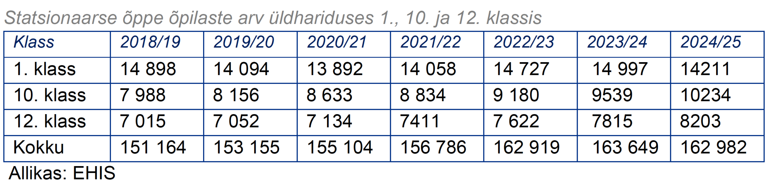Septembris asub üldhariduskoolide statsionaarses õppes õppima ligikaudu 161 000 õpilast, mida on üle tuhande võrra vähem kui aasta tagasi. Prognoosi järgi õpilaste arvu langus lähiaastatel jätkub (sündimuse madalseis annab kooliõpilaste arvus tunda alles tulevikus). Sellel õppeaastal alustab esimest korda kooliteed umbes 14 000 õpilast.
