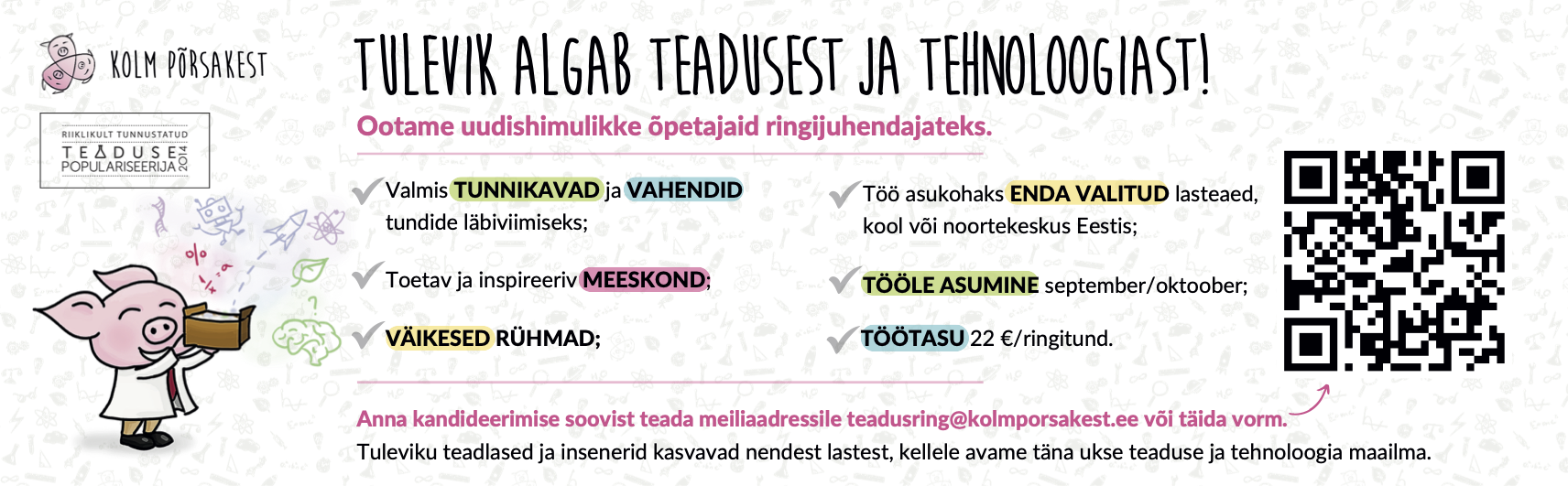 President Alar Karis on öelnud, et väikese rahva suurim rikkus on tarkus. Just teadushuviharidus aitab kasvatada põlvkonda, kes julgeb küsida, katsetada ja luua. Iga särasilmne laps meie teadusringis ja ägedaid kogemusi jaganud juhendaja on märk sellest, et oleme õigel teel. Kui tunned, et ka sinu kogukonnas, asutuses või sõpruskonnas on lapsi, kes võiksid nakatuda teaduspisikuga, siis tule juhendajaks! Piisab huvist ja tahtest – kõik ülejäänu teeme üheskoos teoks.