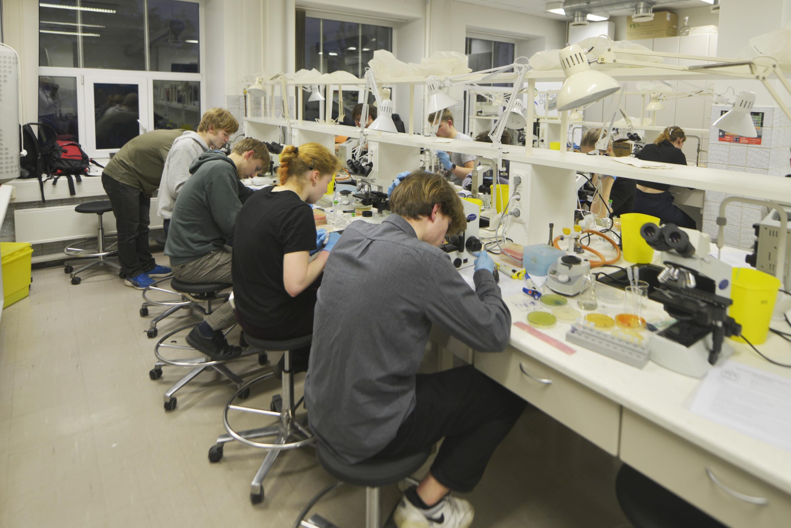 Eesti bioloogiaolümpiaadi (EBO) nädalavahetus algas TÜ tehnoloogiainstituudis, kus molekulaarse taimefüsioloogia kaasprofessor Hanna Hõrak pidas loengu õhulõhede tähtsusest taimede kasvus. Esimene päev jätkus õpilaste praktiliste tööde vooruga. Bioinformaatikatöös tuli osata aru saada ja kasutada veebitööriistu, näiteks joondada mesilaste ja kimalaste fülogeneesipuu alusel tsütokroom C oksüdaasi alaühiku järjestused või teha arvutis linnugripi viiruse H5N1 genoomne analüüs. Hagija soolestiku mikrobioomi metagenoomsel uurimisel selgitati välja soolestikus elutsevad bakteriliigid. Mikrobioloogiapraktikum õpetas kasutama mikropipetti ja mikroskoopi. Õpilastel tuli mikroobe eristada kindlate tunnuste järgi. Spektrofotomeetriga määrati kindlaks soolebakteri Escherichia coli puhaskultuuri bakterite arvukus.
