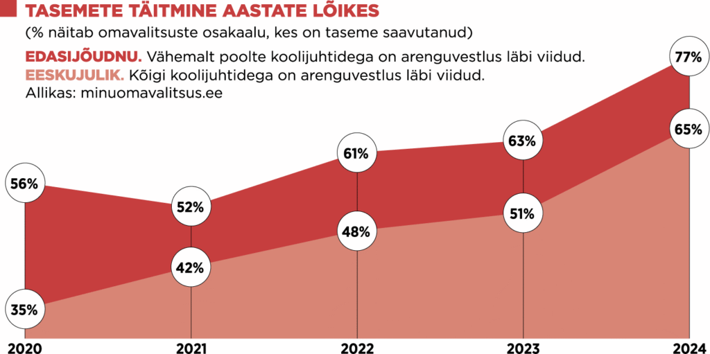 Kehtivate õigusaktide järgi vastutab koolijuhtide töölevärbamise, koolijuhtide töö hindamise ja töötasu kokkuleppimise eest konkreetse kooli pidaja ehk valdavalt kohalik omavalitsus, järgides seaduses kehtestatud direktori kvalifikatsiooninõudeid. Koolipidajaid toetavad ka Heateo Haridusfondi ja Fontese veetud ning koolijuhtide, koolipidajate, ülikoolide ja ministeeriumi kokkuleppel uuendatud haridusjuhtide kompetentsimudel ja selle juhendmaterjal. Andmed kinnitavad, et aasta-aastalt on rohkem neid omavalitsusi, kes regulaarselt oma koolijuhtide töö tulemuslikkust hindavad ja arendavad. (Vt graafikut)