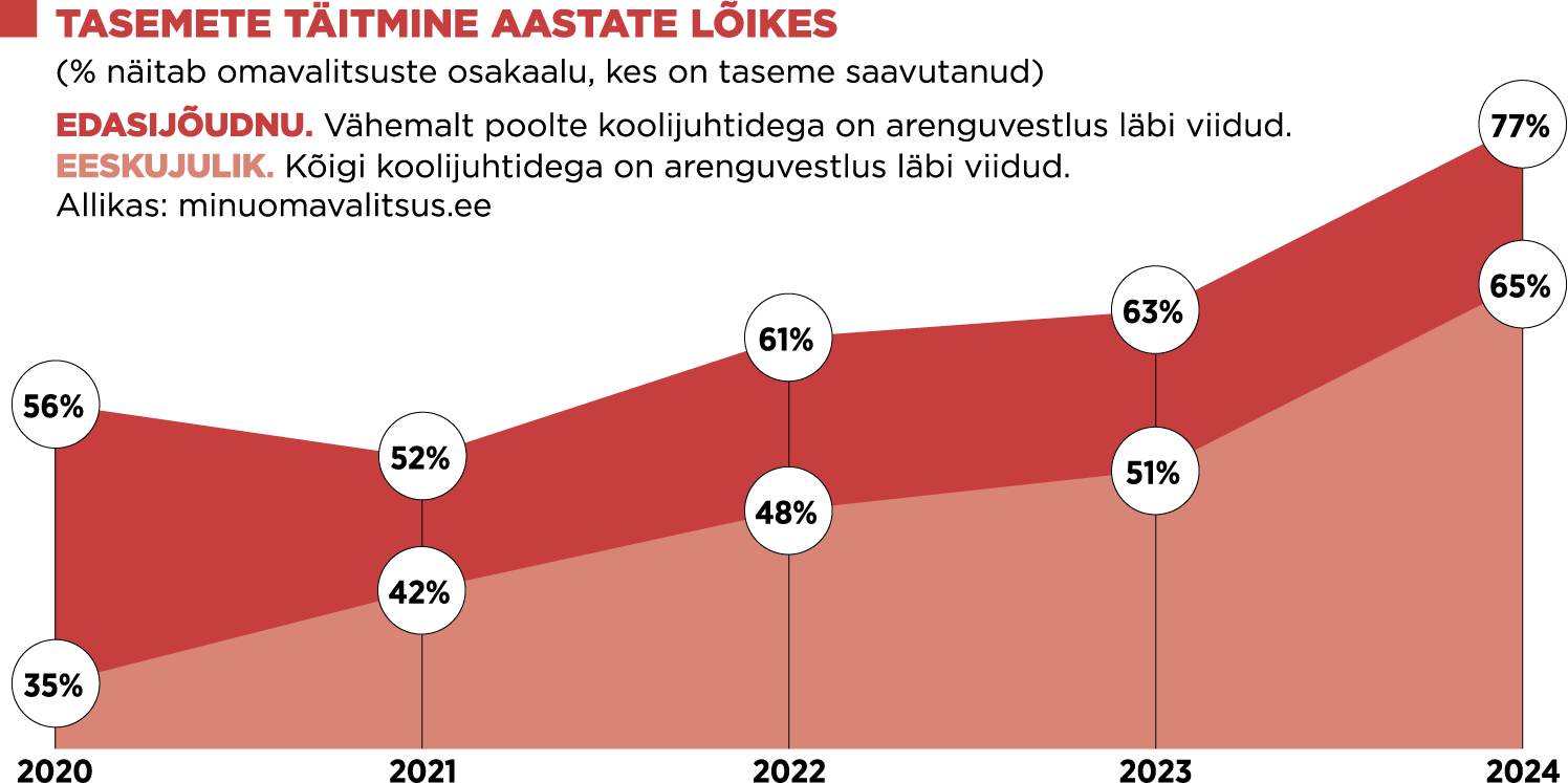 Kehtivate õigusaktide järgi vastutab koolijuhtide töölevärbamise, koolijuhtide töö hindamise ja töötasu kokkuleppimise eest konkreetse kooli pidaja ehk valdavalt kohalik omavalitsus, järgides seaduses kehtestatud direktori kvalifikatsiooninõudeid. Koolipidajaid toetavad ka Heateo Haridusfondi ja Fontese veetud ning koolijuhtide, koolipidajate, ülikoolide ja ministeeriumi kokkuleppel uuendatud haridusjuhtide kompetentsimudel ja selle juhendmaterjal. Andmed kinnitavad, et aasta-aastalt on rohkem neid omavalitsusi, kes regulaarselt oma koolijuhtide töö tulemuslikkust hindavad ja arendavad. (Vt graafikut)