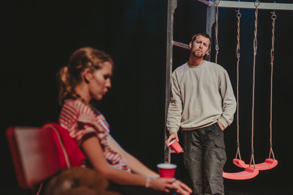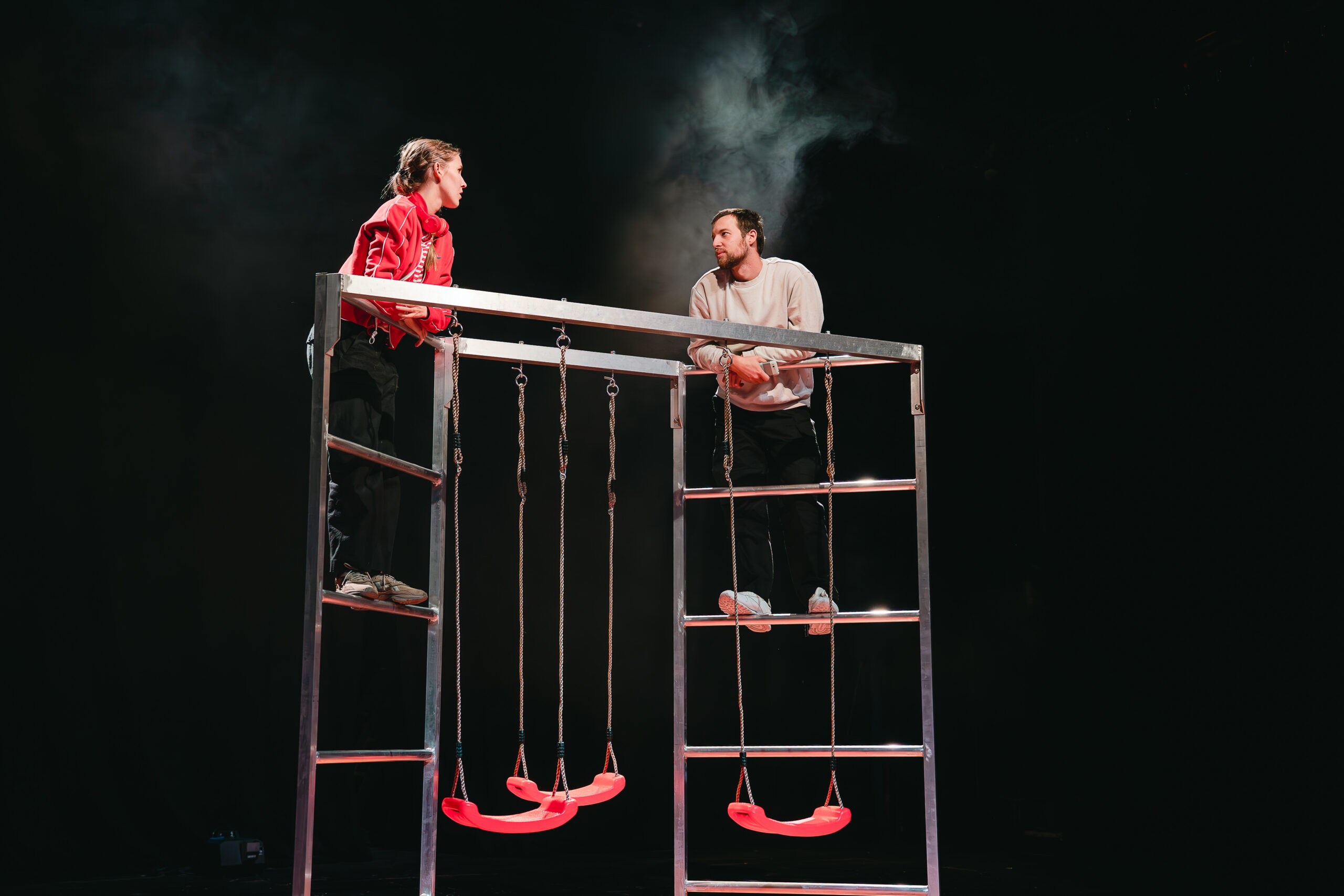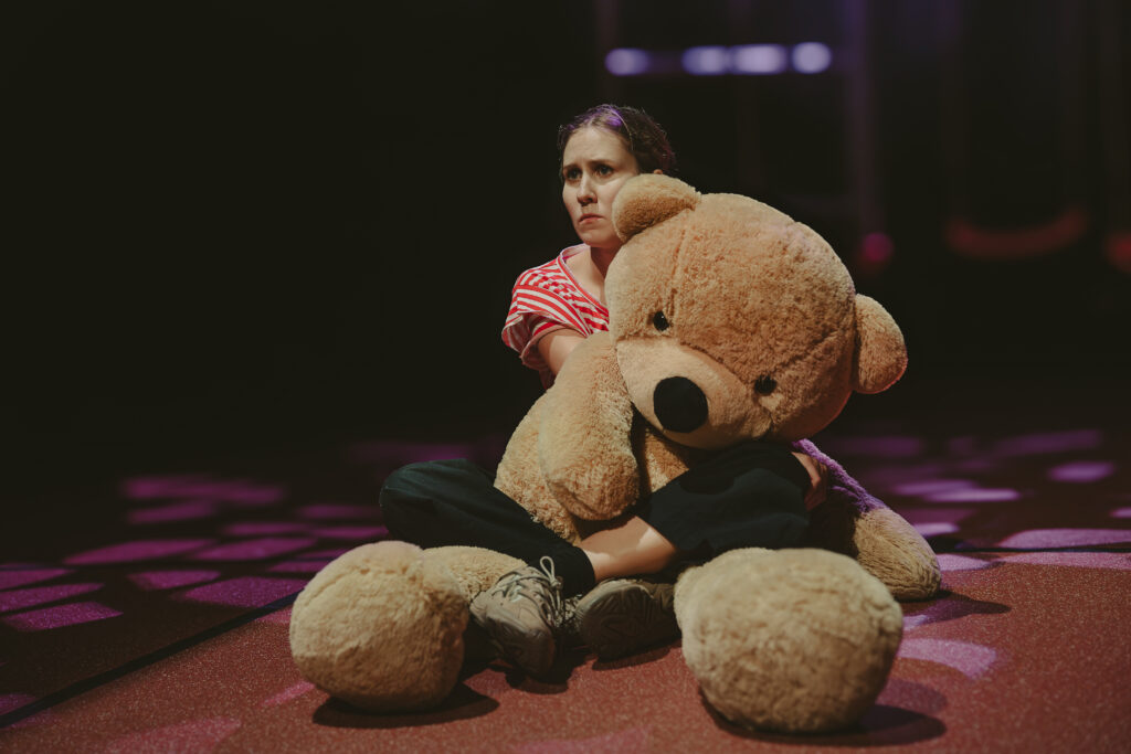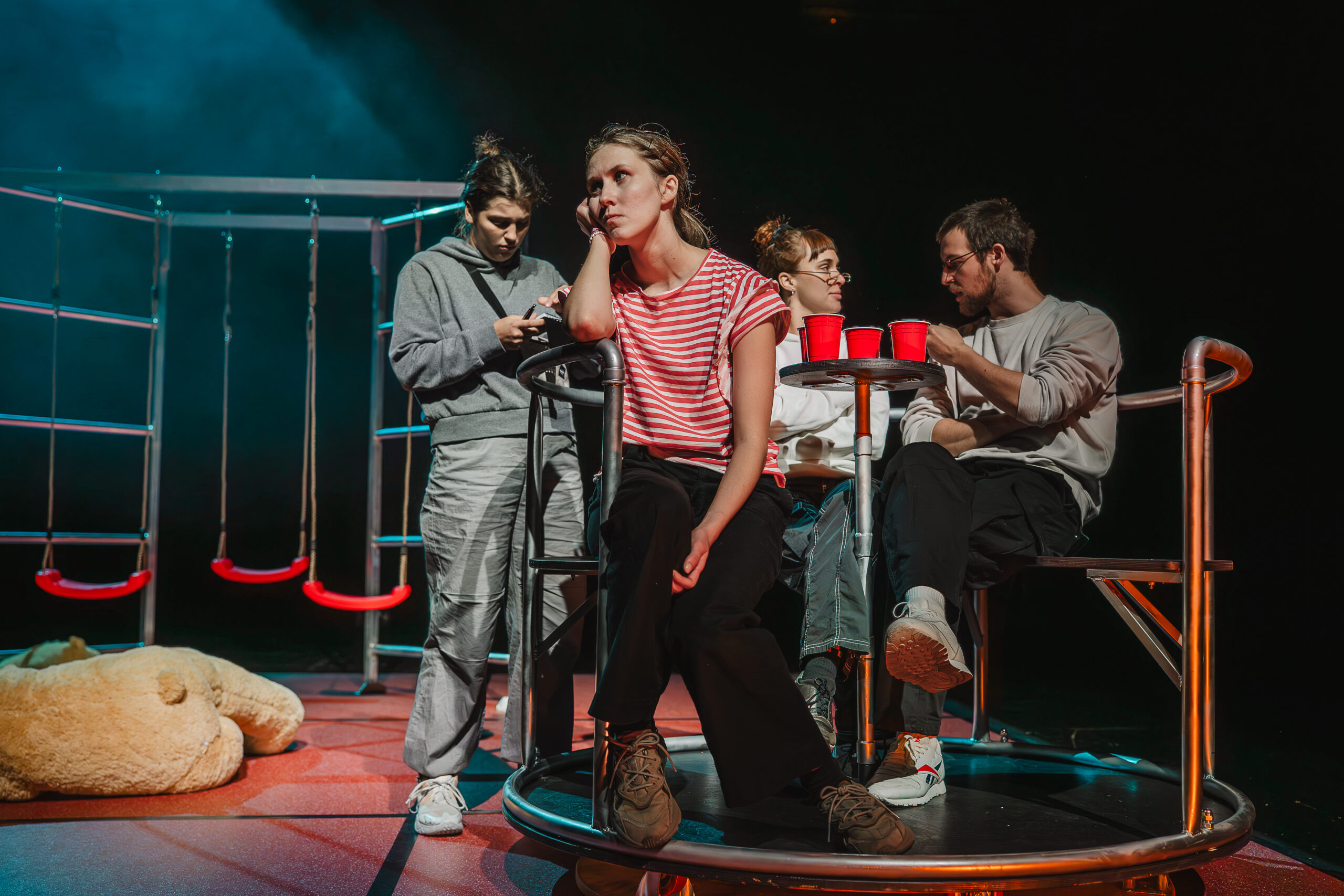 Kui publik saali siseneb, mängivad neli näitlejat juba laval, mille kunstnik Joel Väli on kujundanud mänguväljakuks pargis karusselli, kiikede, ronimisredelitega. Anonüümne ruum võimaldab tegevuspaiku kärmelt vahetada ja peegeldab ka peategelase kodutusetunnet. Neljateistkümneaastase Sandra elu lapsepõlvest lahtilaskmise hapral piiril toonitavad mitmes suuruses mängukarud, tähistades pelgupaika, turvatunde lootust jms. Mõjuv on, kuidas Sandra poeb mängukarude kuhila nagu teki alla, püüdes muutuda nähtamatuks. Leidlikke misanstseene näeb teisigi.