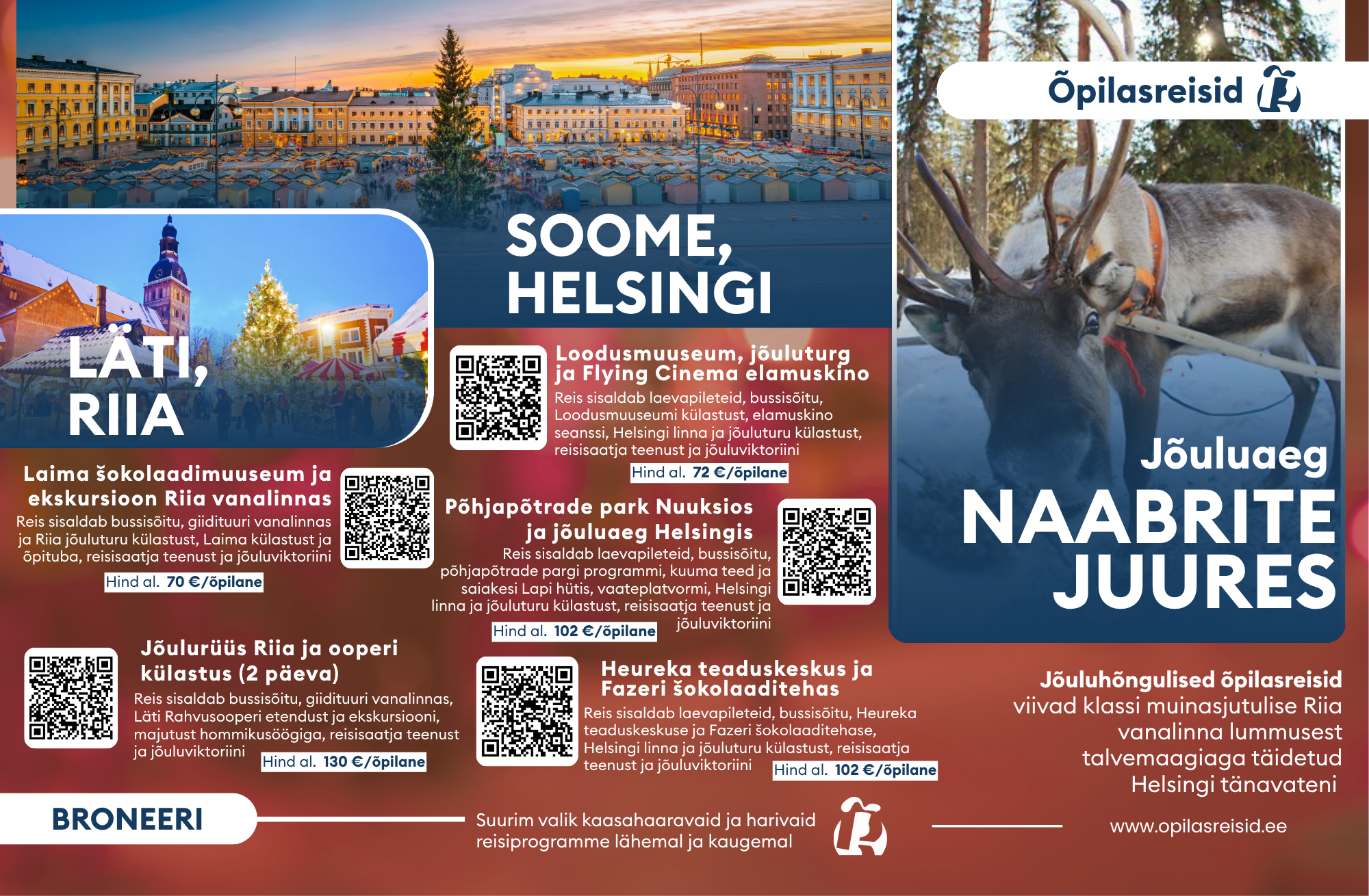 Meie reisikorraldajad aitavad leida just sinu klassile ideaalse reisi aasta ringi, aga jõuluajal soovitame piiluda, kuidas naabrid pühi tähistavad – muinasjutuline Riia ja talvemaagiline Helsingi ootavad.