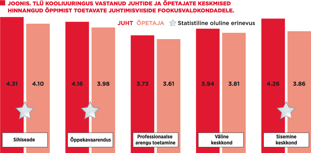 Tallinna Ülikooli kooliuuringu tulemustest tuleb esile, et kõigi viie valdkonna keskmised tulemused on üle keskmise (vt joonis). Õpetajate ja koolide juhtkonna liikmete antud hinnanguid kõrvutades selgub, et juhid (direktor, õppe-, õppekorraldus-, huvijuht jne) kipuvad mõnevõrra ootuspäraselt hindama juhtimist kõigis viies valdkonnas veidi kõrgemalt kui õpetajad. Oluliselt lahknevad juhtide ja õpetajate hinnangud sihiseadele, õppekavaarendusele ja kõige enam kooli toetava sisemise keskkonna kujundamisele.
