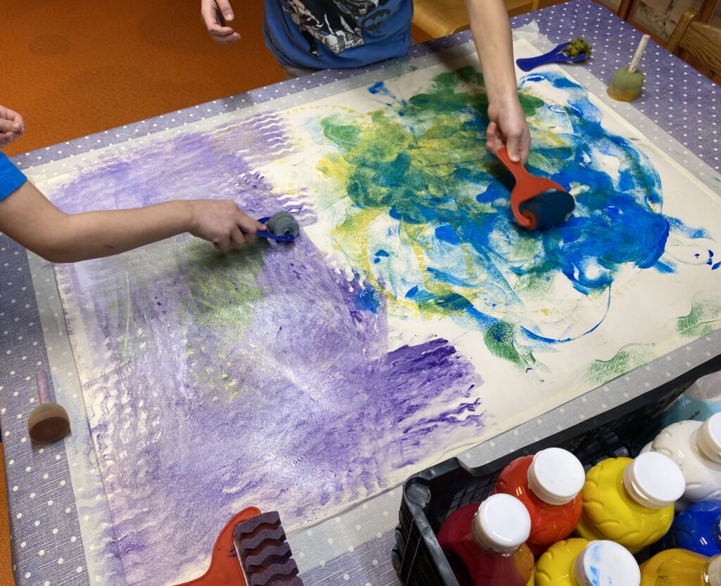 Gruppi võtan võimalusel eri rühmade lapsed, et nad saaksid harjutada sotsiaalseid oskusi: üksteistega tuttavaks saada, omavahel suhelda. Vahel lasengi neil kordamööda joonistada, nii et üks joonistab pool minutit ja teine pool minutit ning siis jälle vahetavad. Ka täiesti võõrad lapsed saavad joonistades kohe kontakti. Vahel annan kahe peale suure paberi, kuhu nad joonistavad, maalivad või kätega värvivad. Isegi kui alguses tundub, et nad teineteist segavad, hakkab tasapisi koostöö laabuma. Mõnikord tõmbavad lapsed joone vahele – ühel pool on ühe ja teisel pool teise lapse pilt. Teinekord lepivad sõbralikult kokku ja teevad koostööd.