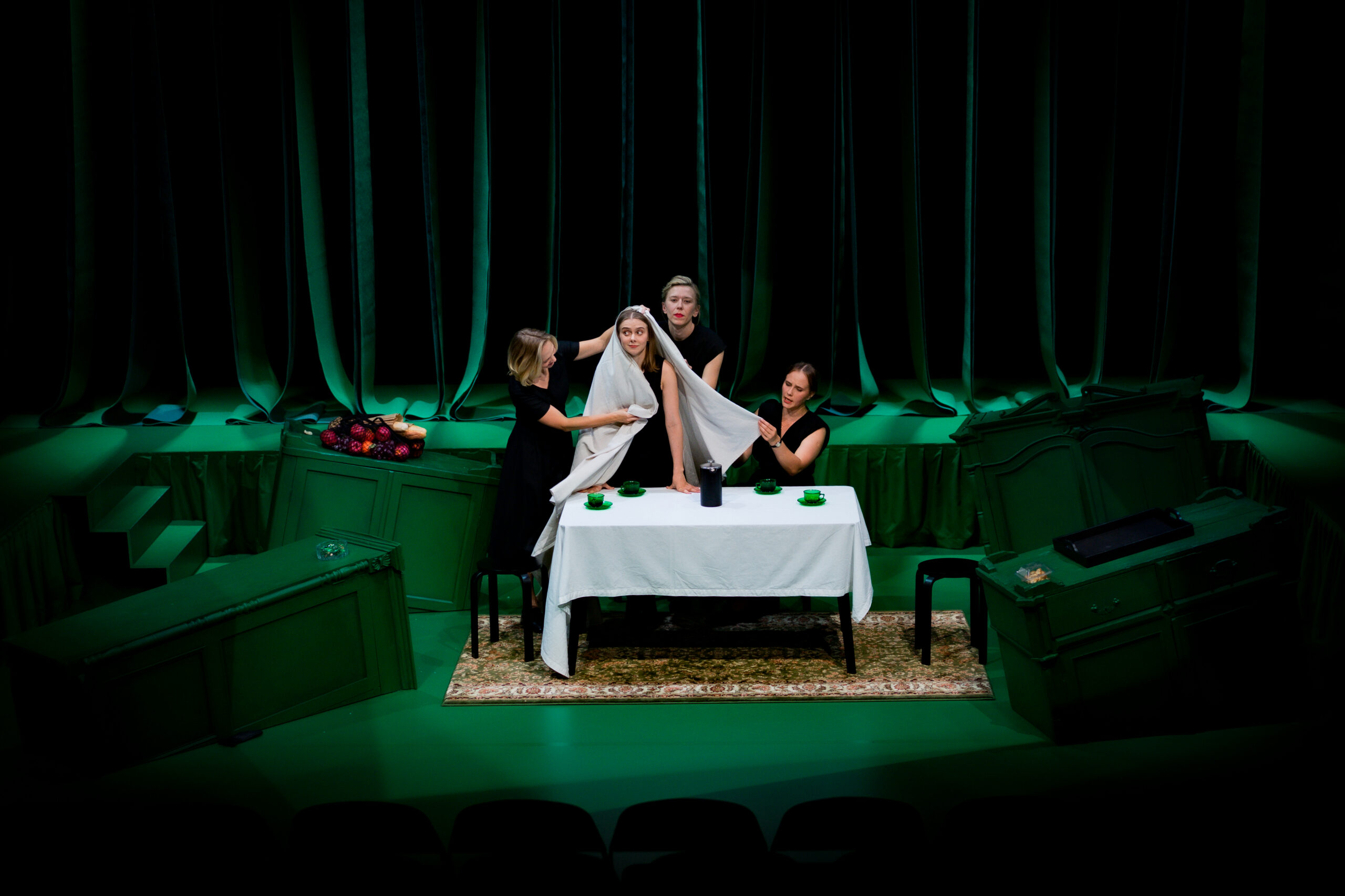 Mustad kostüümid rõhutavad ajatut elegantsi kui põlvkondade sidet, mis aitab üleval hoida fassaadi. Ajatule haute couture’i väljanägemisele viitasid ka Arkadiy Statsenko reklaamfotod. Veel ühe kunstnikutöö õnnestunud kujundina võib nimetada kappe, kuhu iga põlvkond on end peitnud. Kapid ei seisa aga sirgelt püsti, vaid on asetatud kergelt kaldu – mis tahes esemeid kapile asetades tuleb olla hoolikas, et see sealt ära ei vajuks. Tugev kujund, mis ei torka aga sõrmega silma, vaid annab võimaluse ehitada üles enda tõlgendusi.