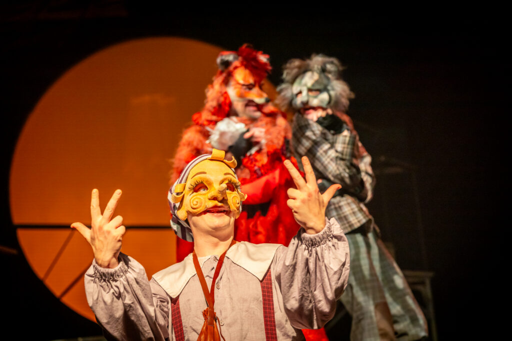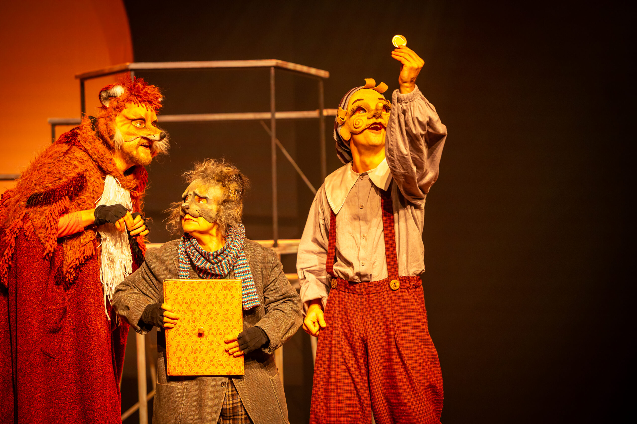 Sarnaselt Hotzenplotziga kasutatakse ka nüüd commedia dell’arte poolmaske, selle teatritraditsiooni tegelaskujudest on laval ainult Arlecchino ja põgusa hetke ka Pulcinella, Collodi raamatusse kirjutatud tegelased. Nukkudeks on üks suur mitmekesi juhitav lauanukk – Pinocchio esineb nii nuku kui näitlejana – ning lind ja madu.