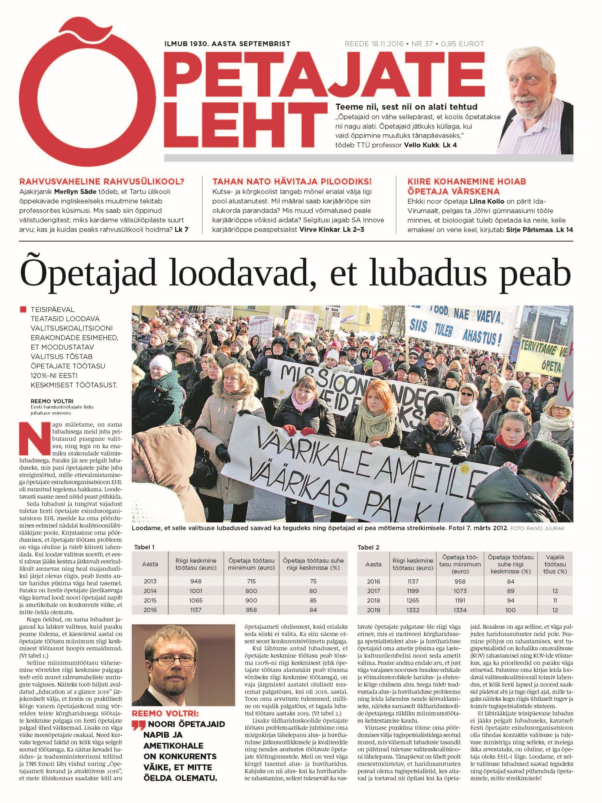 „Teisipäeval teatasid loodava valitsuskoalitsiooni erakondade esimehed, et moodustatav valitsus tõstab õpetajate töötasu 120%-ni Eesti keskmisest töötasust. Nagu mäletame, on sama lubadusega meid juba peibutanud praegune valitsus, ning tegu on ka enamiku erakondade valimislubadusega,” kirjutab Eesti haridustöötajate liidu juhatuse esimees Reemo Voltri.