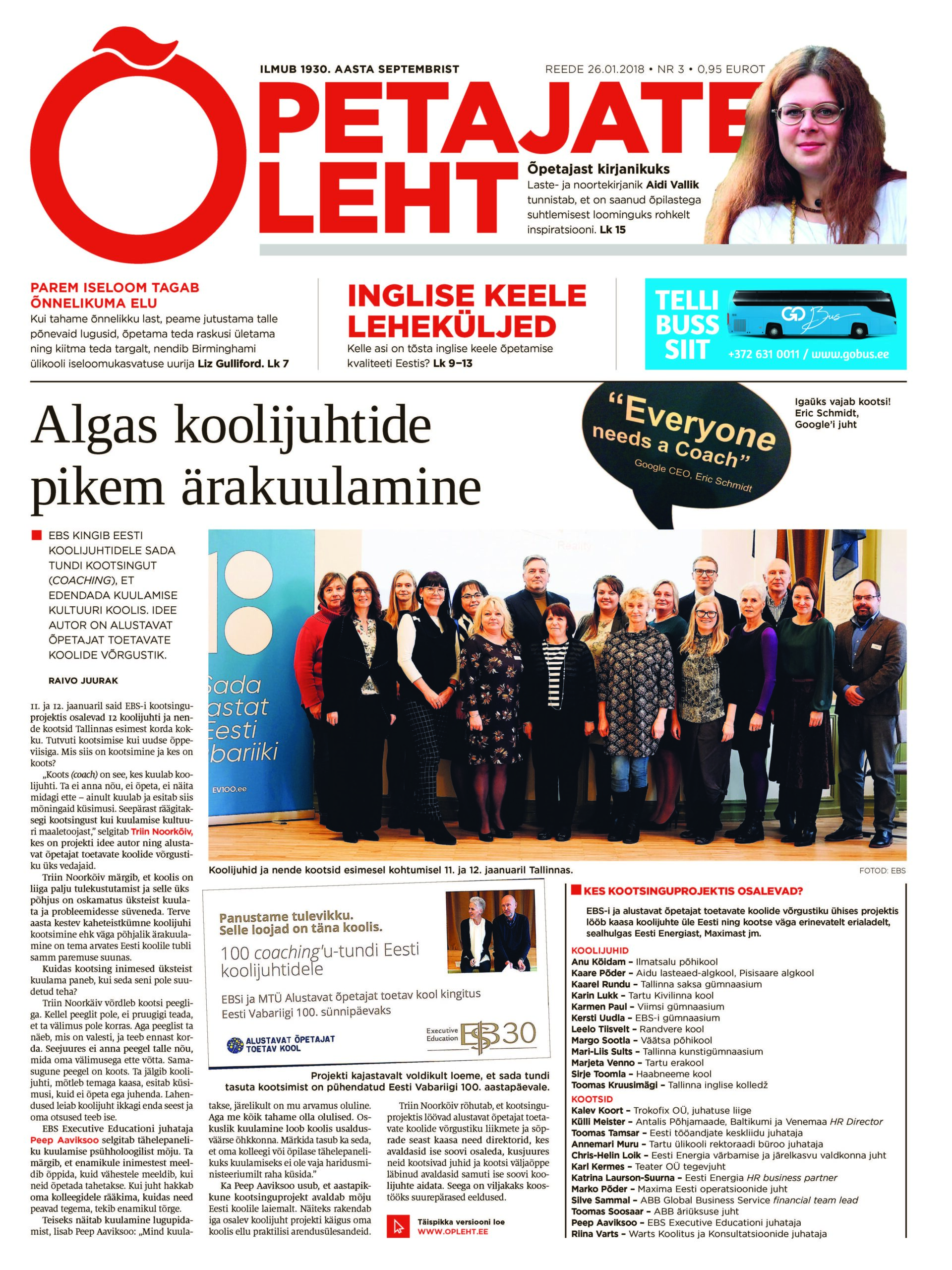 EBS ja alustavat õpetajat toetavate koolide võrgustik alustasid 11. jaanuaril sada tundi kestvat kootsinguprojekti, milles osalevad koolijuhid rakendavad kootside toel oma koolides ellu mitmeid uuendusi. Kootsing toob Eesti kooli uut moodi kuulamise kultuuri, rõhutavad projekti eestvedajad Triin Noorkõiv ja Peep Aaviksoo: Projekti kommenteerivad ka koolijuhid Karin Lukk, Mari-Liis Sults, Sirje Toomla ja Karmen Paul.